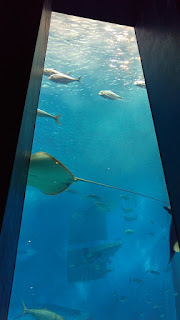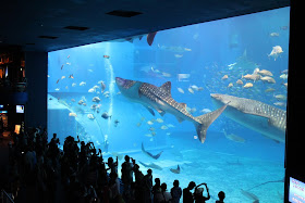 大概14xx到美麗海水族館(map code 553076767)進去順著走就會到大水族箱黑潮之海,可以在旁邊的咖啡廳坐一下、喝杯飲料,一般到水族館都是走馬看花,坐在咖啡廳裡可以很放空的看魚,也可以讓長輩休息一下,感覺很不一樣。